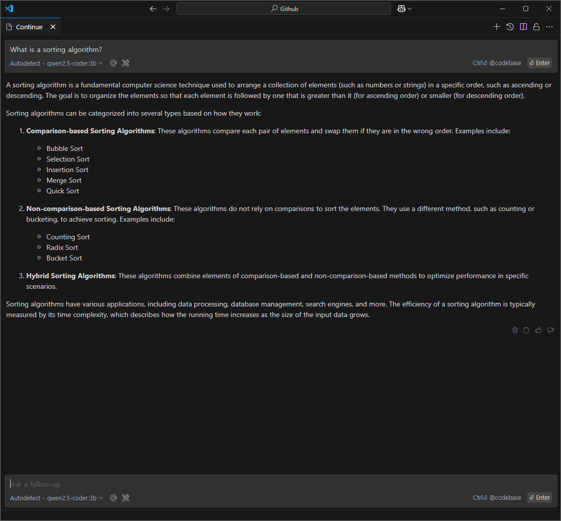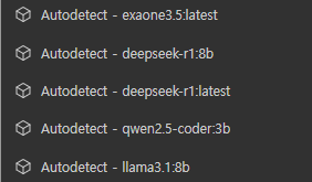 코드를 수정해주는 모델로는 qwen2.5-coder:1.5b가 추천되는데, 사용해보니 qwen2.5-coder:3b도 시간이 비슷하며 성능이 더 높은 3b모델로 설정하여 사용하는 것이 좋을 것 같다. 다른 모델을 사용해봤지만 qwen2.5-coder:3b가 가장 성능이 좋게 느껴졌다.
