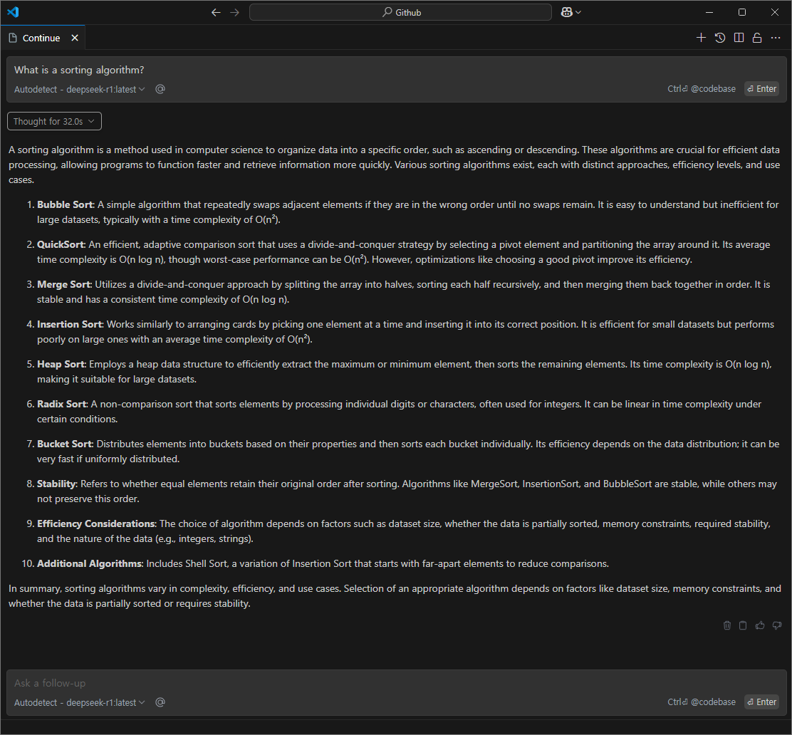 딥시크는 내부적으로 바로 답변을 못하고 스스로 질문을 하는 프로세스로 빠지기도 하는데 같은 질문을 해도 바로 나오는 경우가 있고, 고민하다 답변을 하는 경우가 있다. 기존에 사용할 때는 7b는 스스로 생각하는 과정이 잘 없었는데 이번 테스트에서 추론을 하여 30초 정도 시간이 소요됨을 확인할 수 있었다.